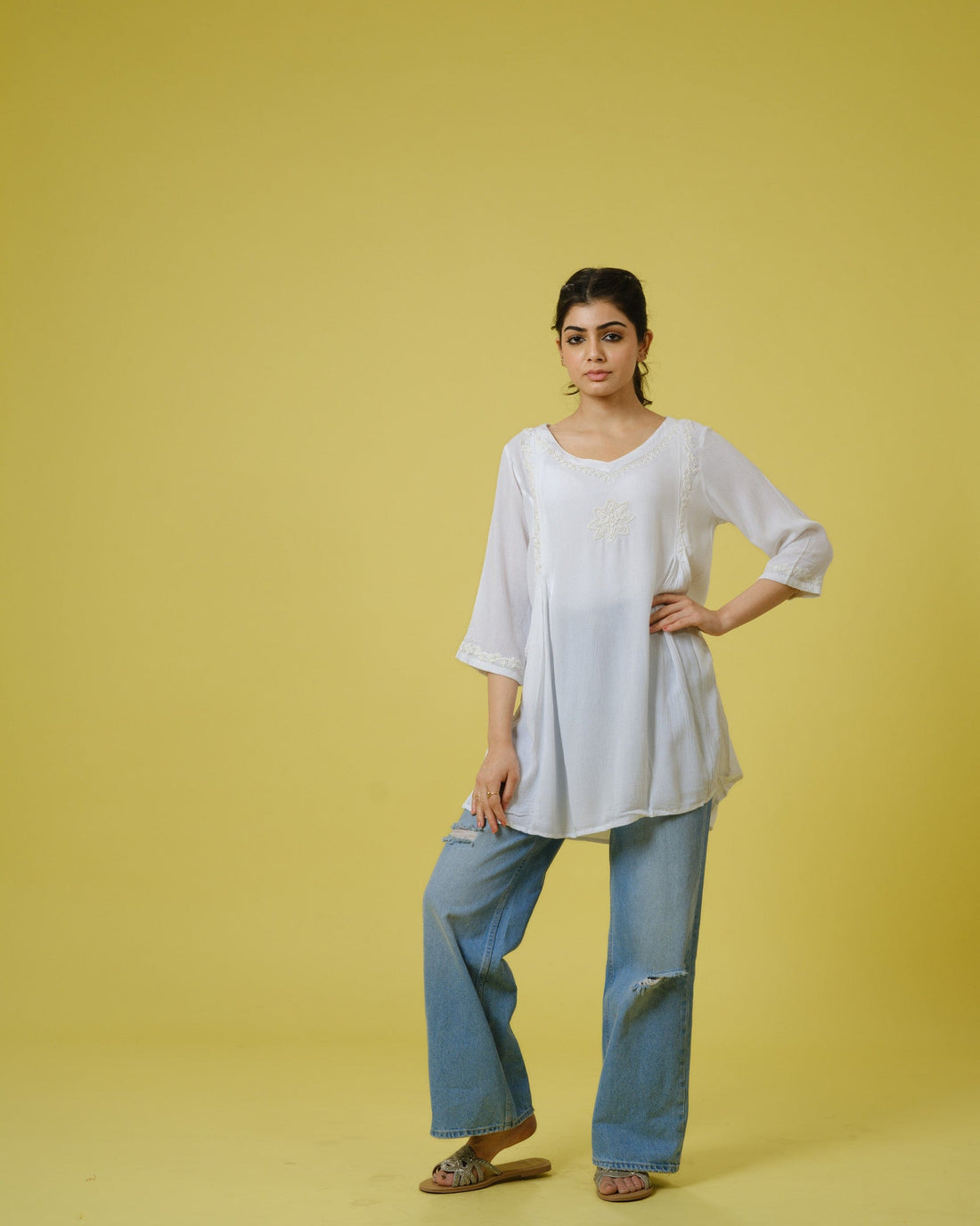 Off-White Chiffon Hip-Length Top with Tonal Floral Thread Work & 3/4th Sleeves – Elegant Lightweight Everyday Wear