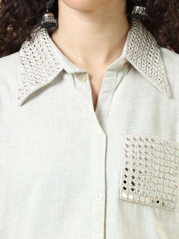 Top Design: Subtle mirror embellishments on off-white rayon–viscose fabric